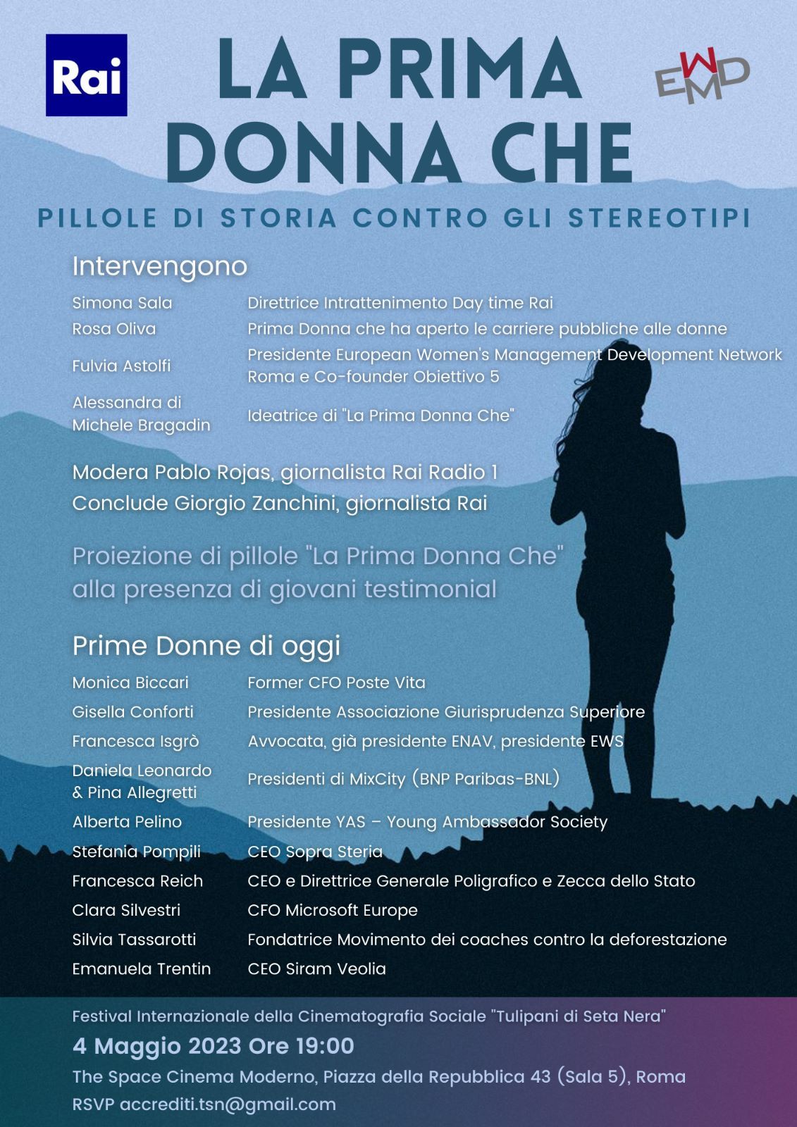 Si è svolto il 4 maggio, a The Space Cinema Moderno di Roma,nell’ambito di "Tulipani di Seta Nera” il Festival Internazionale della Cinematografia Sociale, l’evento di presentazione della nuova serie di “La prima donna che” di Alessandra di Michele Bragadin, 25 pillole di 2- 3 minuti contro gli stereotipi di genere, prodotte da Rai intrattenimento Day Time con la collaborazione della Commissione Pari Opportunità della Rai. L’ evento è stato organizzato in collaborazione con EWMD Roma.