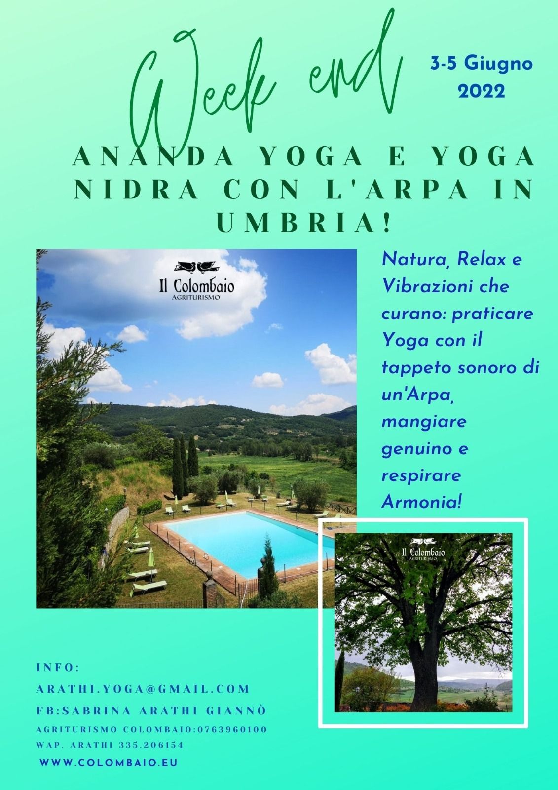 Dove trovare il mare sonoro? Presso l’agriturismo Il Colombaio, Via di Parrano, Montegabbione, in Umbria, dal 3 al 5 giugno. L’insegnante di Ananda Yoga, Sabrina Arathi Giannò, conduce la pratica yogica mentre con l’arpa celtica accompagno gli asana e lo yoga Nidra, tradotto in sonno cosciente, rilassamento profondo dai riverberi pacificanti sul corpo e la mente.
