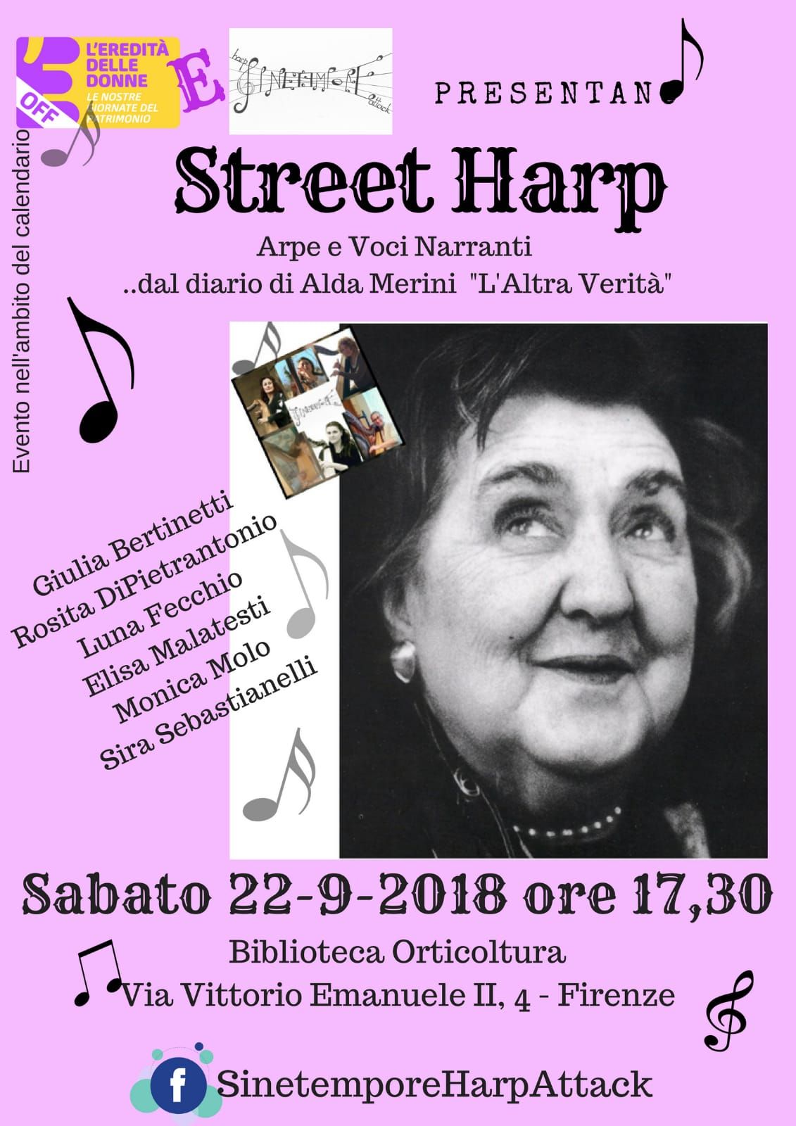 La città di Firenze, in occasione delle Giornate Europee del Patrimonio, ospita la prima edizione de L’Eredità delle Donne, un festival, che prende avvio il 21 settembre e si protrarrà fino al 23 settembre, dedicato alle donne che hanno contribuito ad alimentare il patrimonio culturale e artistico, a livello nazionale e internazionale, al punto di meritare il giusto riconoscimento di “Madri della Patria”. Il progetto, con la direzione di Serena Dandini, è promosso da Elastica e dalla Fondazione Cassa di Risparmio di Firenze. Gli eventi che si svolgeranno nei tre giorni sono molti, tra questi, rientrati nel Cartellone L’EREDITÀ DELLE DONNE OFF, c’è lo spettacolo STREET HARP, dedicato ad Alda Merini. Sei arpe celtiche dell’Ensemble Sinetempore Harp Attack, il 22 settembre alle 17,30 presso la Biblioteca Orticoltura di Firenze, accompagneranno la lettura del testo di Alda Merini “L’altra verità. Diario di una diversa”.