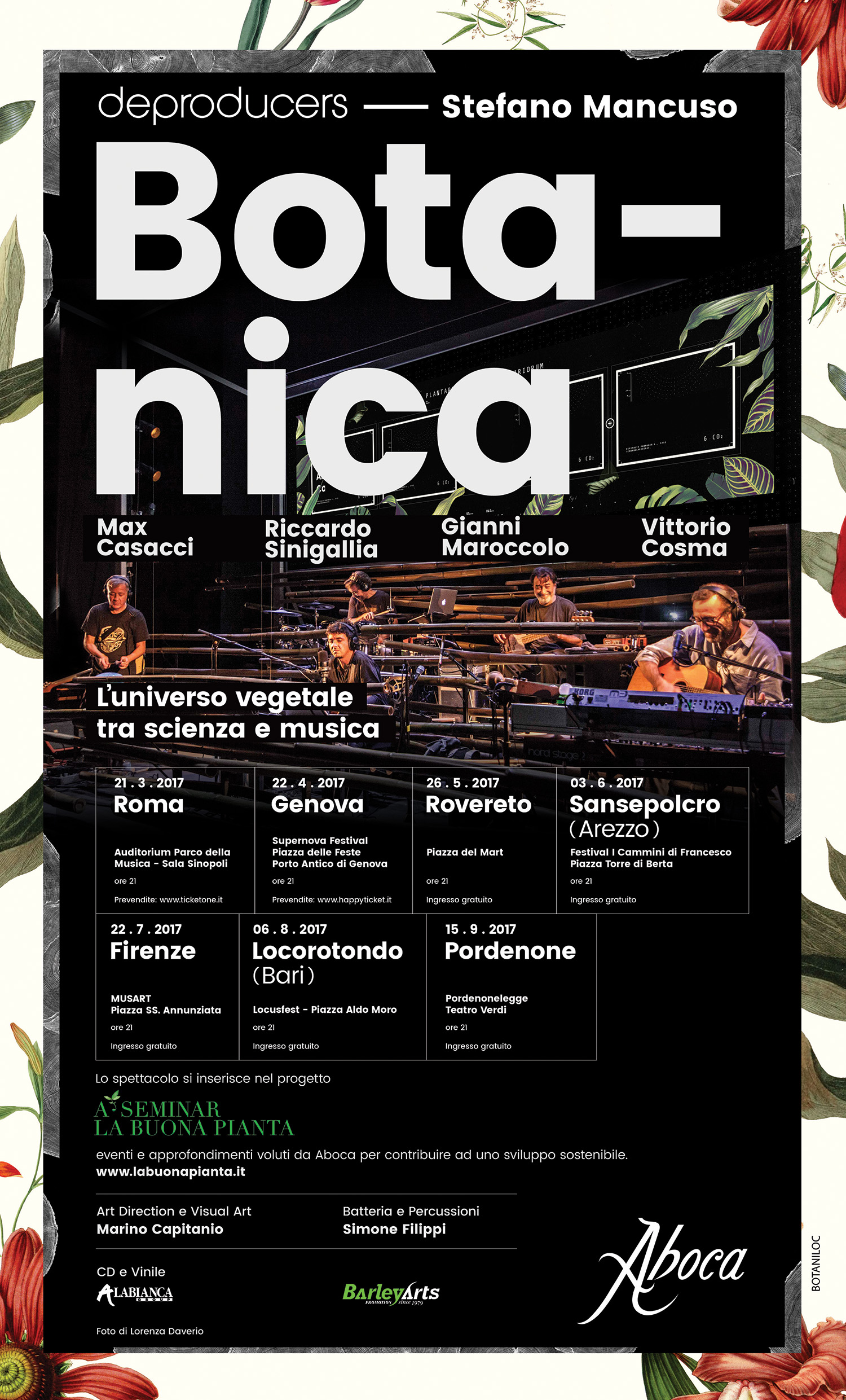 Botanica è uno spettacolo molto particolare che ha debuttato a Roma all’Auditorium Parco della Musica. Il progetto ha come protagonisti i Deproducers, eccezionale collettivo musicale formato da Vittorio Cosma, Riccardo Sinigallia, Gianni Maroccolo e Max Casacci, il professor Stefano Mancuso, scienziato di prestigio mondiale e Aboca la grande azienda italiana che dalla natura e dalle piante medicinali trae soluzioni avanzate per la salute dell’uomo nel rispetto dell’ambiente e che qui è coideatrice e coproduttrice del progetto.